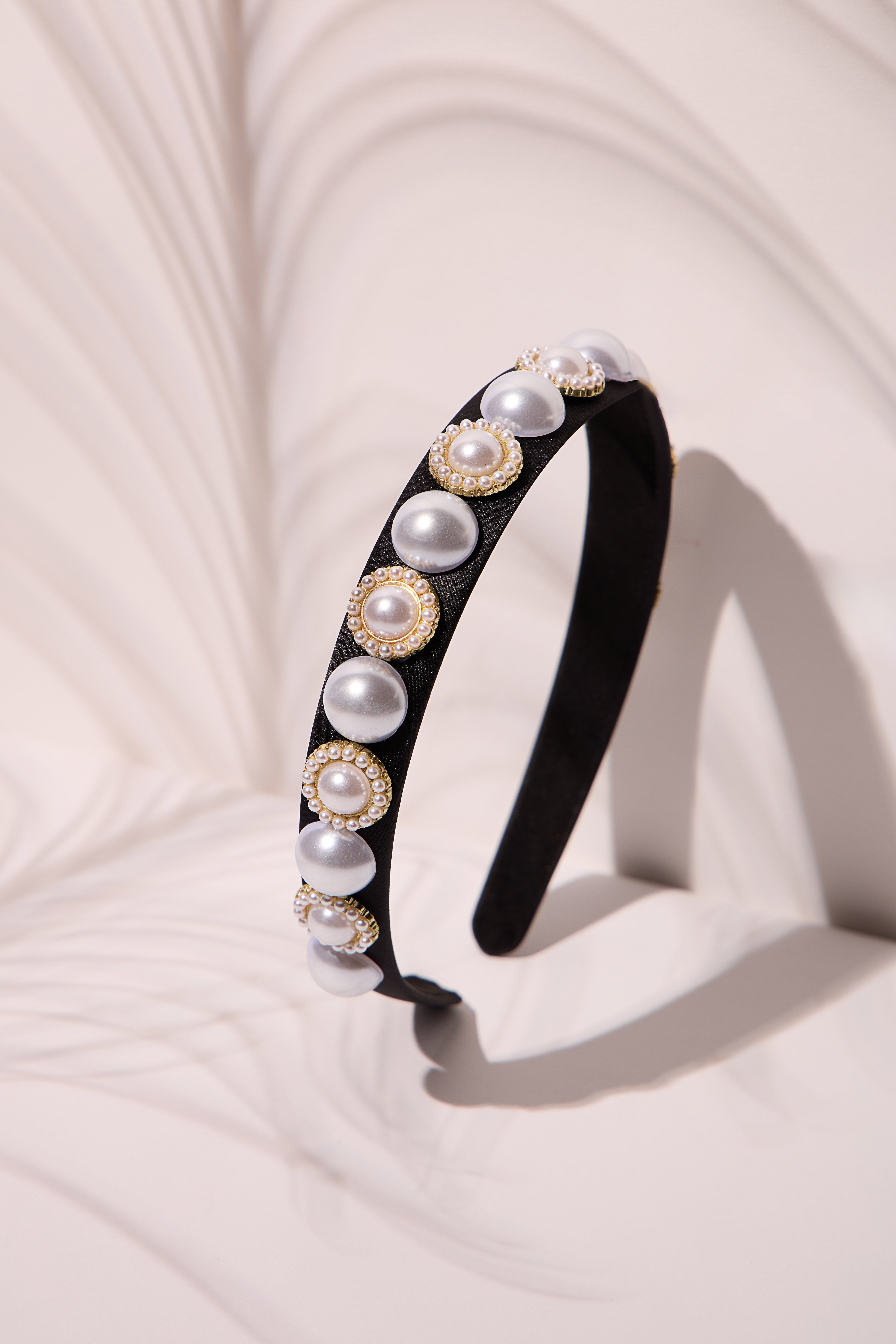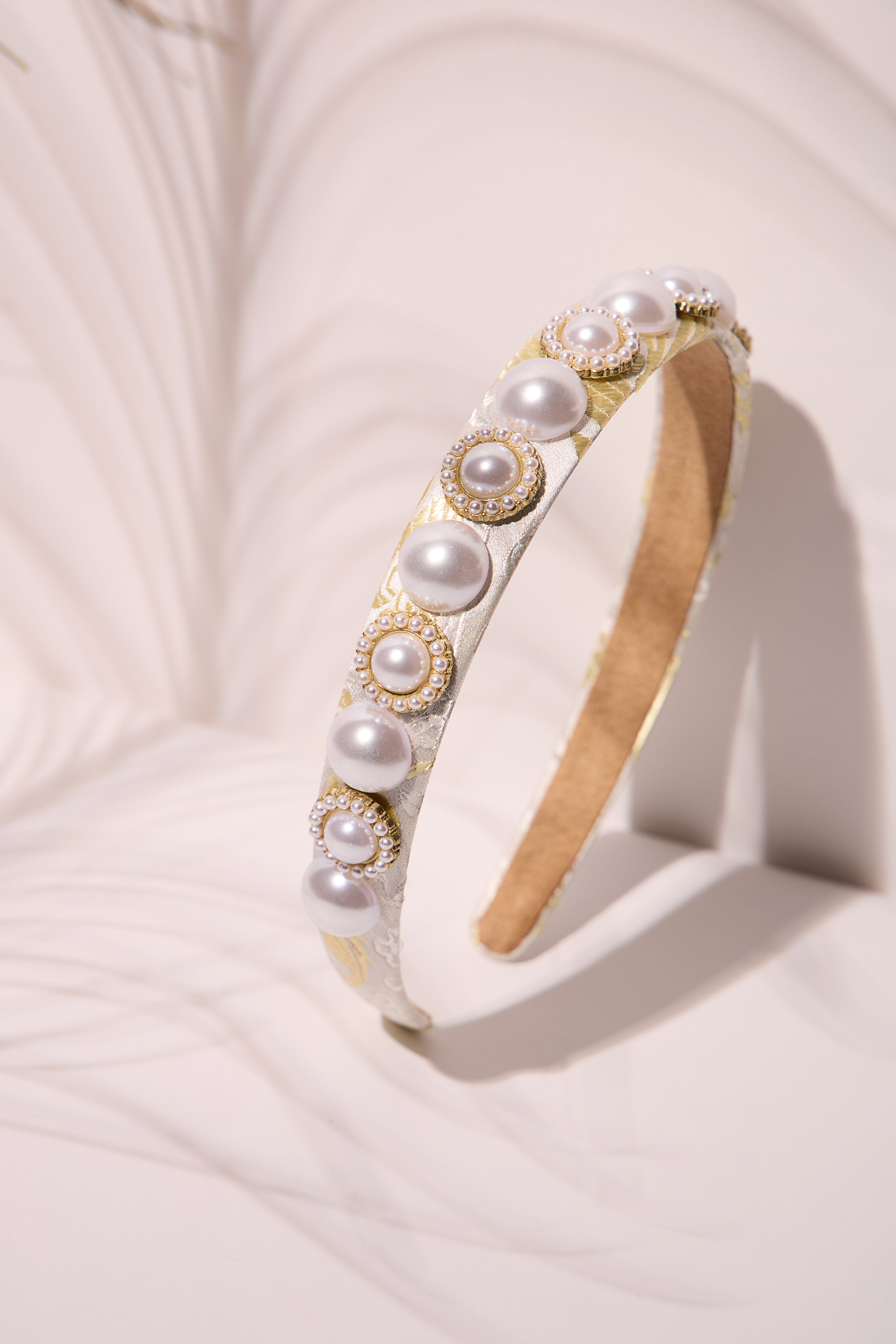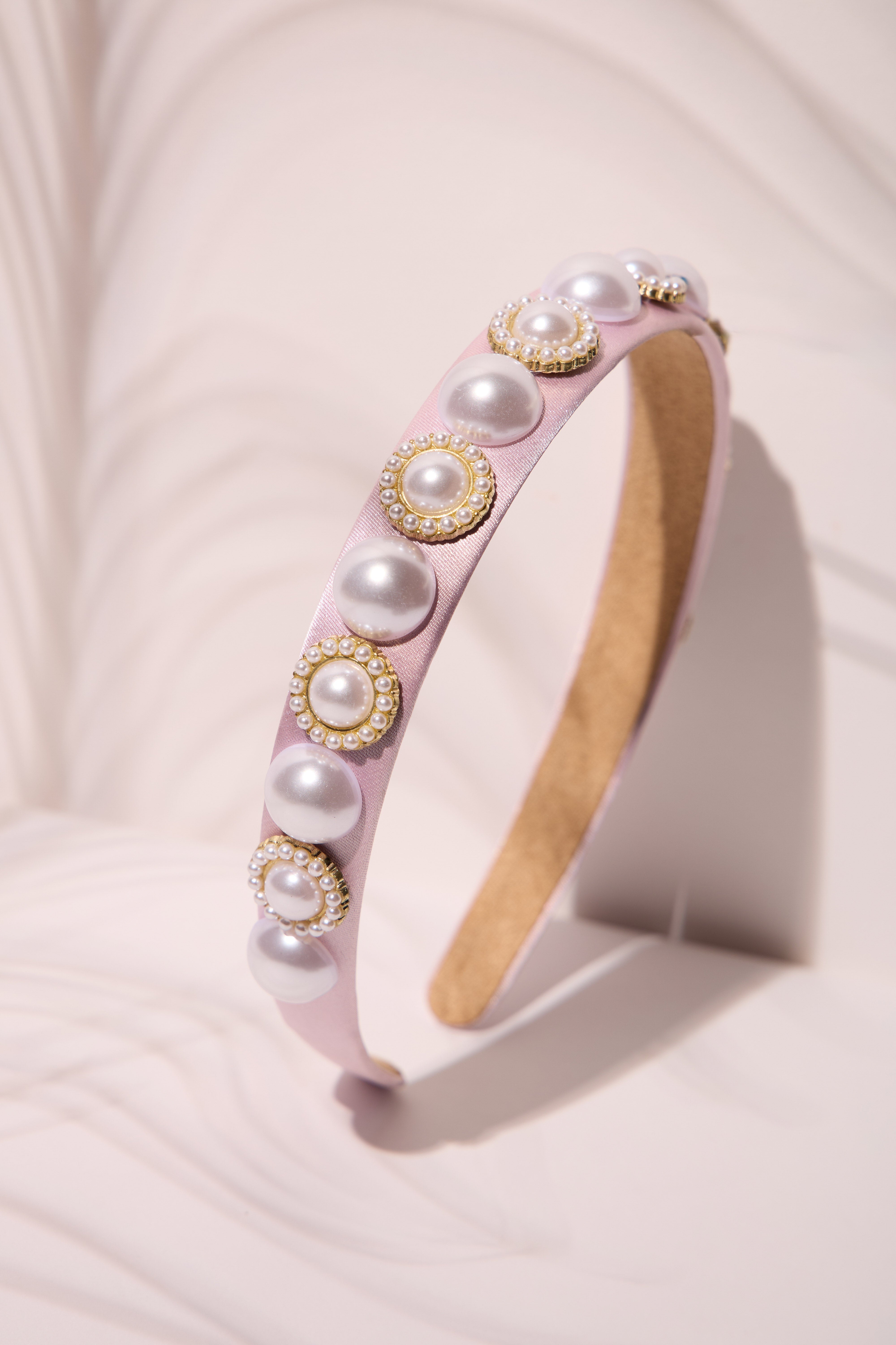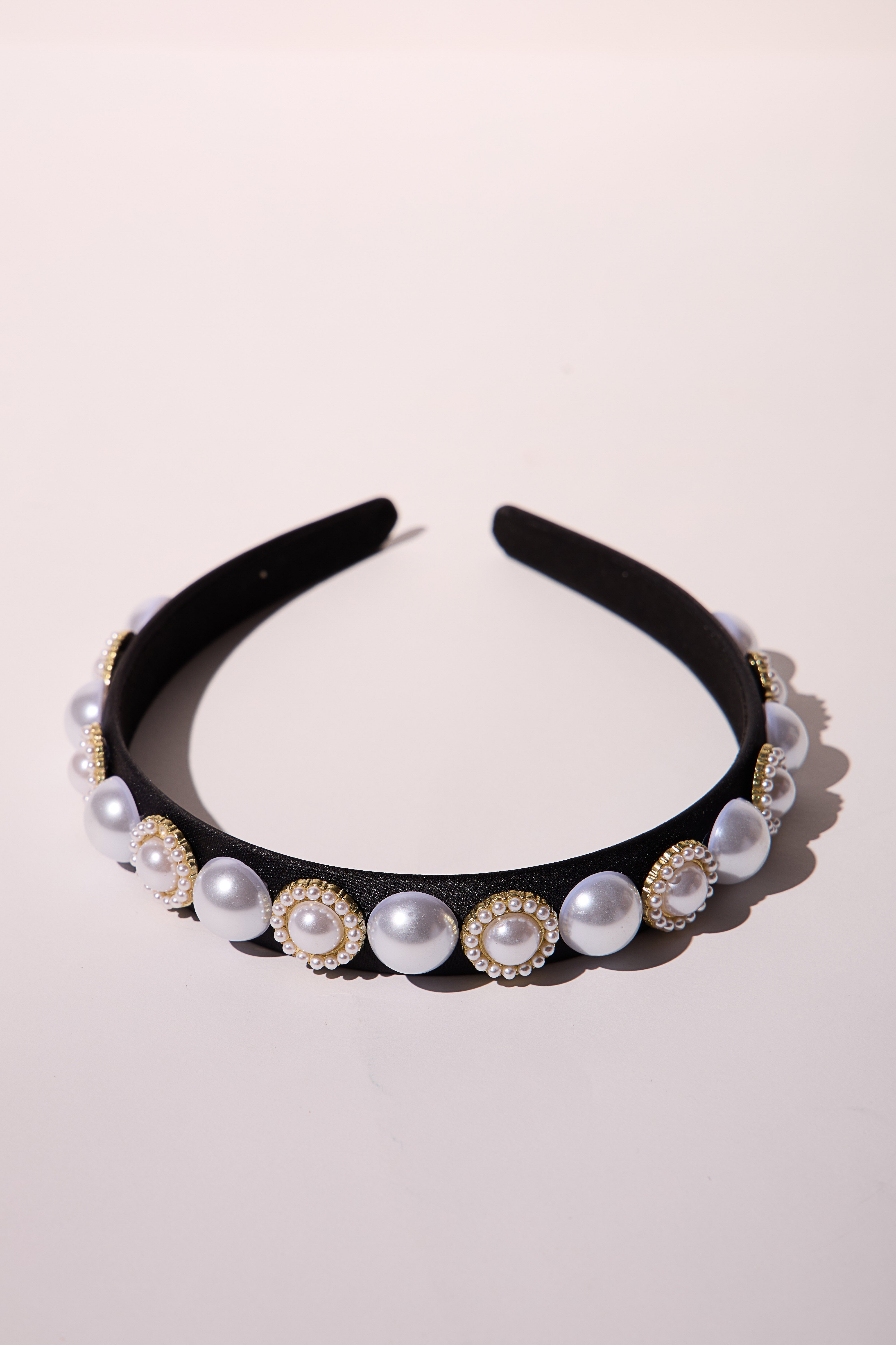 A chic headband with pearls all over, adding a refined and elegant touch.